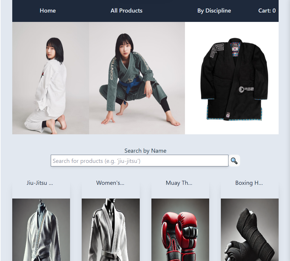 MartialMart is a responsive e-commerce web application for browsing and purchasing martial arts equipment. Users can search for products by name, filter items based on discipline, gender, and price range, and add products to their cart. The application showcases a modern UI with dynamic filtering and state management, creating a seamless shopping experience. React, React Router, Tailwind CSS, React Hooks.